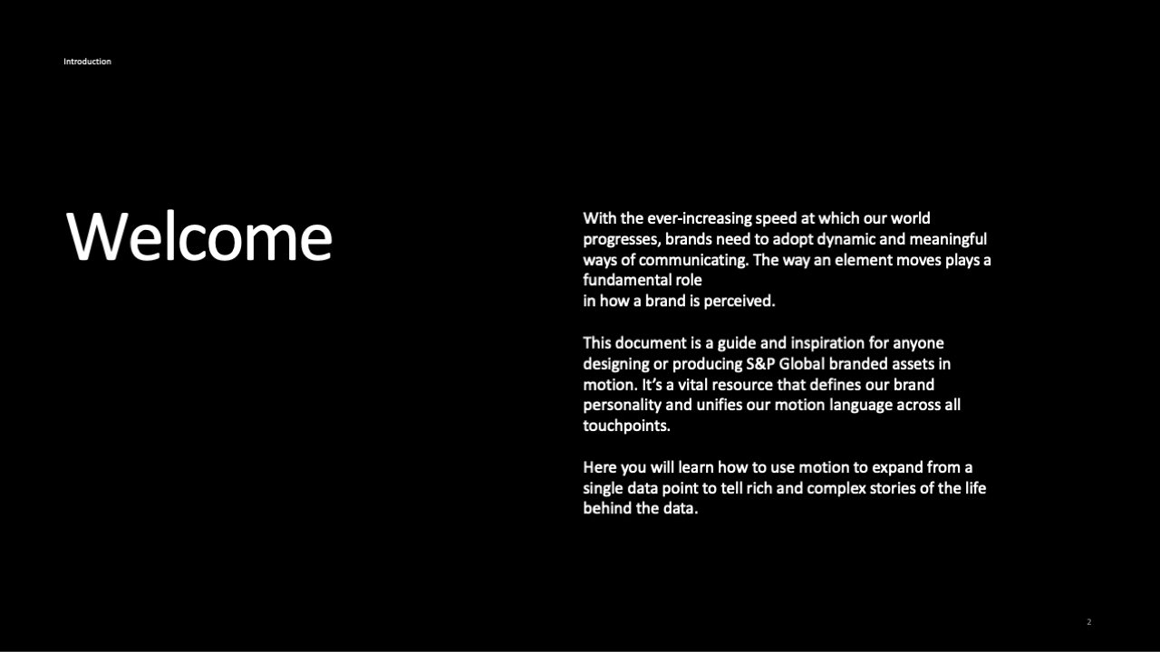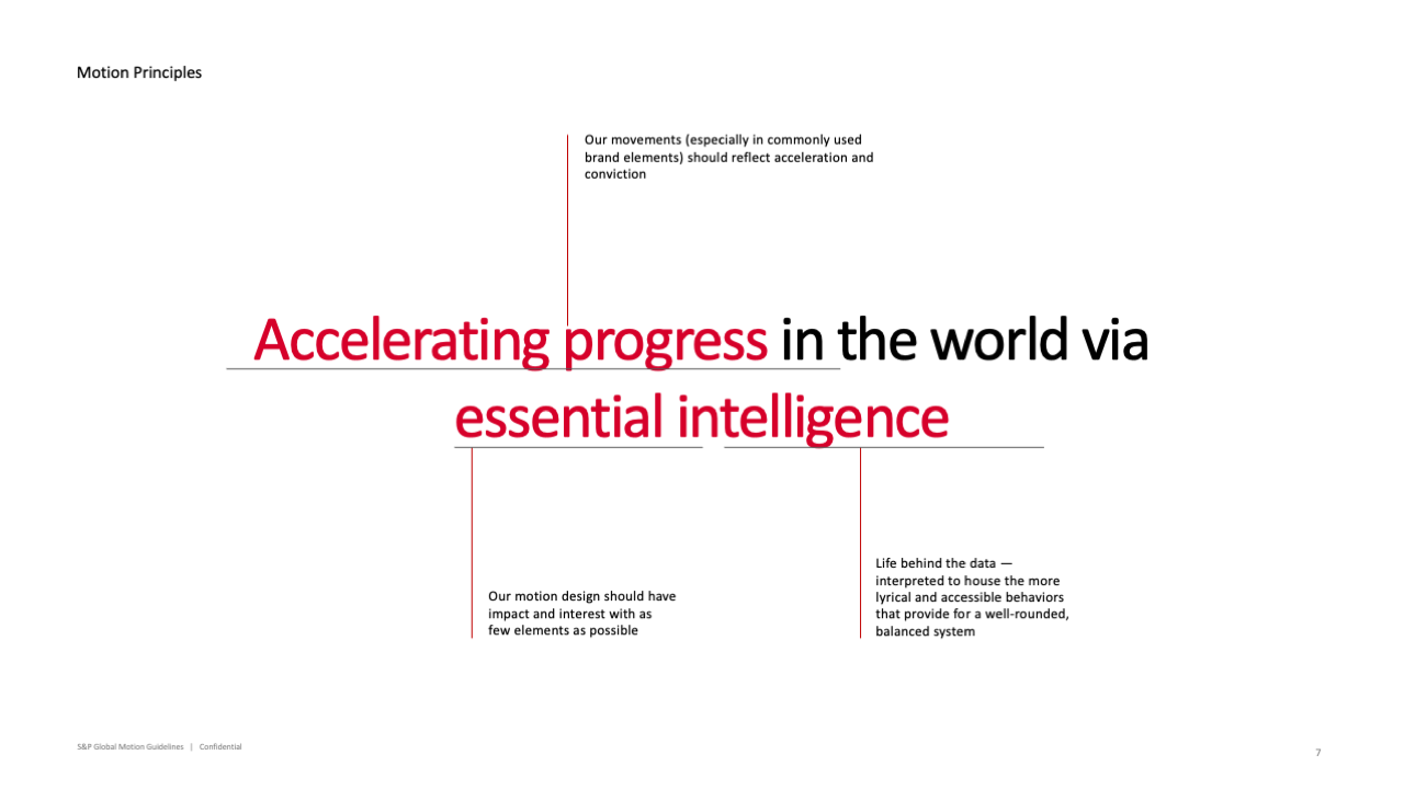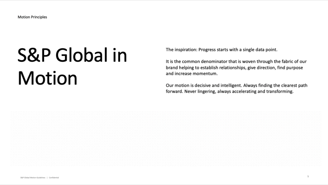 These animations became a cornerstone for how the team strategically built S&P Global’s motion guidelines document. Logo animation, ‘portal’ development/animation, and data visualization animations are all pieces that were used to build these guidelines.
